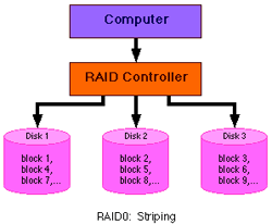 Level 0 is not redundant, hence does not truly fit the "R.A.I.D." acronym. In level 0, information is split across drives, resulting in higher data throughput. Since no redundant information is stored, performance is very good, but the failure of any disk in the array results in information loss. This level is commonly referred to as striping. |